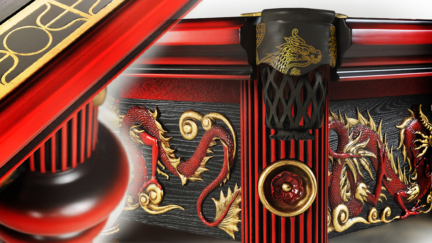 Фигуры драконов украшают лафет стола и киевницу. Отливка фигур драконов сделана из цветной смолы по авторской лепнине скульпторов, работающих в китайском стиле.