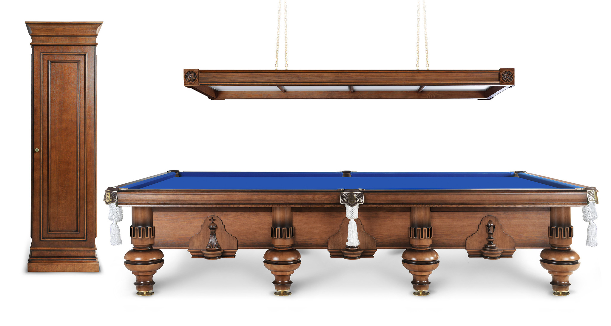 Бильярдная коллекция «Гроссмейстер» вобрала в себя не только эксклюзивность комплектующих и натуральные природные материалы, но и уникальные технологии изготовления. Коллекция включает в себя бильярдный стол, киевницу и светильник.