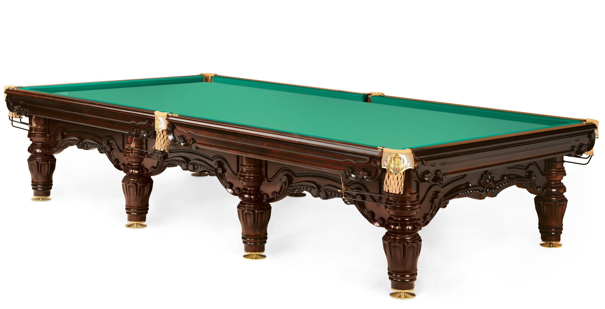 Резные элементы отделки в стиле барокко, выполненные вручную, придают столу императорское величие. Интересная особенность модели – необычные ноги с полностью округлой верхней частью, чего нет у бильярдов других производителей.