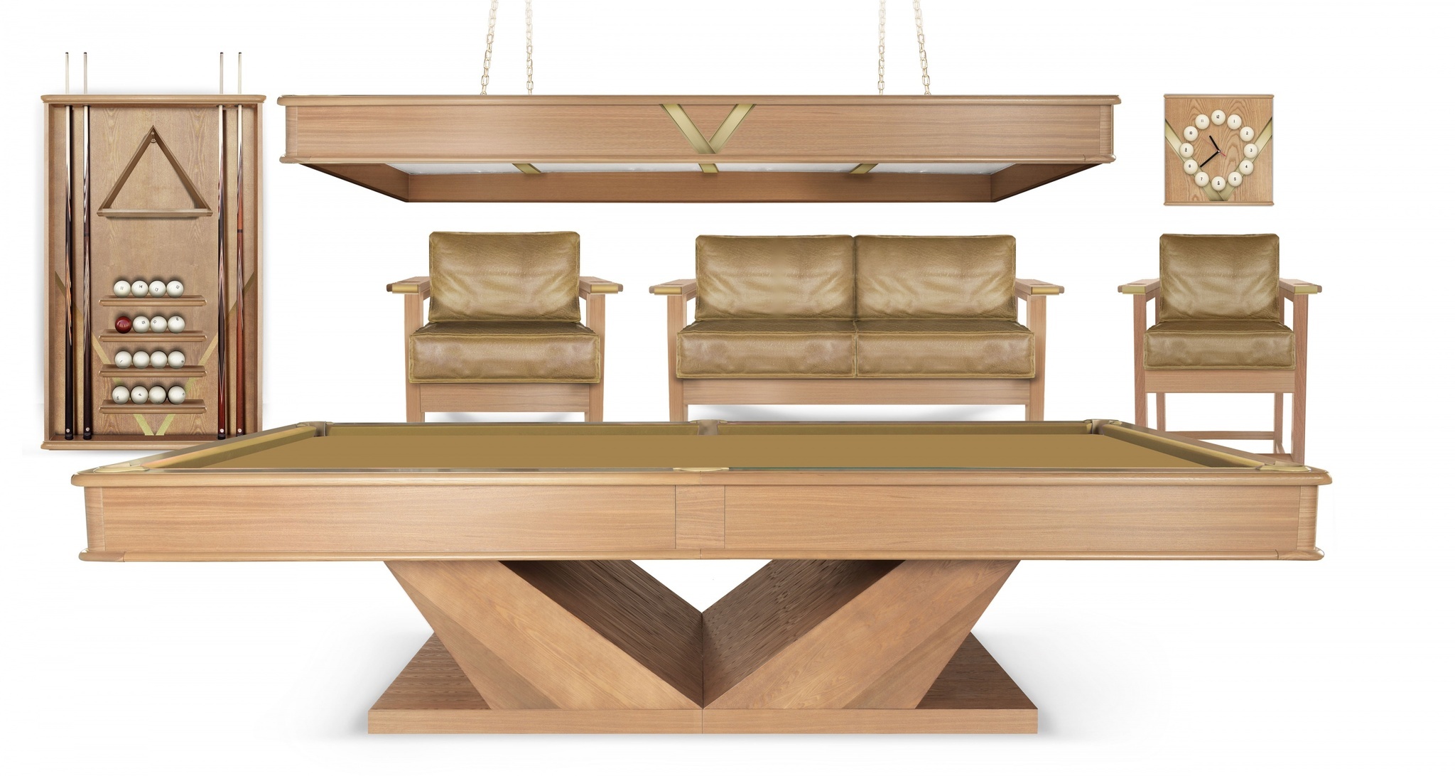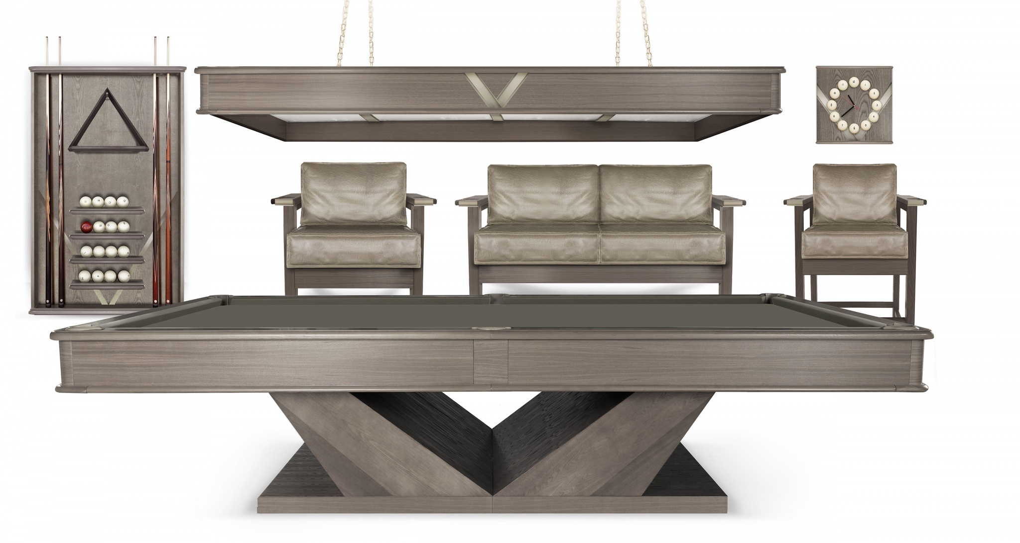 Композиция коллекции строится на четком ритме прямых линий, плоскостей и граней. Строгая геометрия предметов мебели превосходно дополняет бильярдный стол и подчеркивает стилистику коллекции.