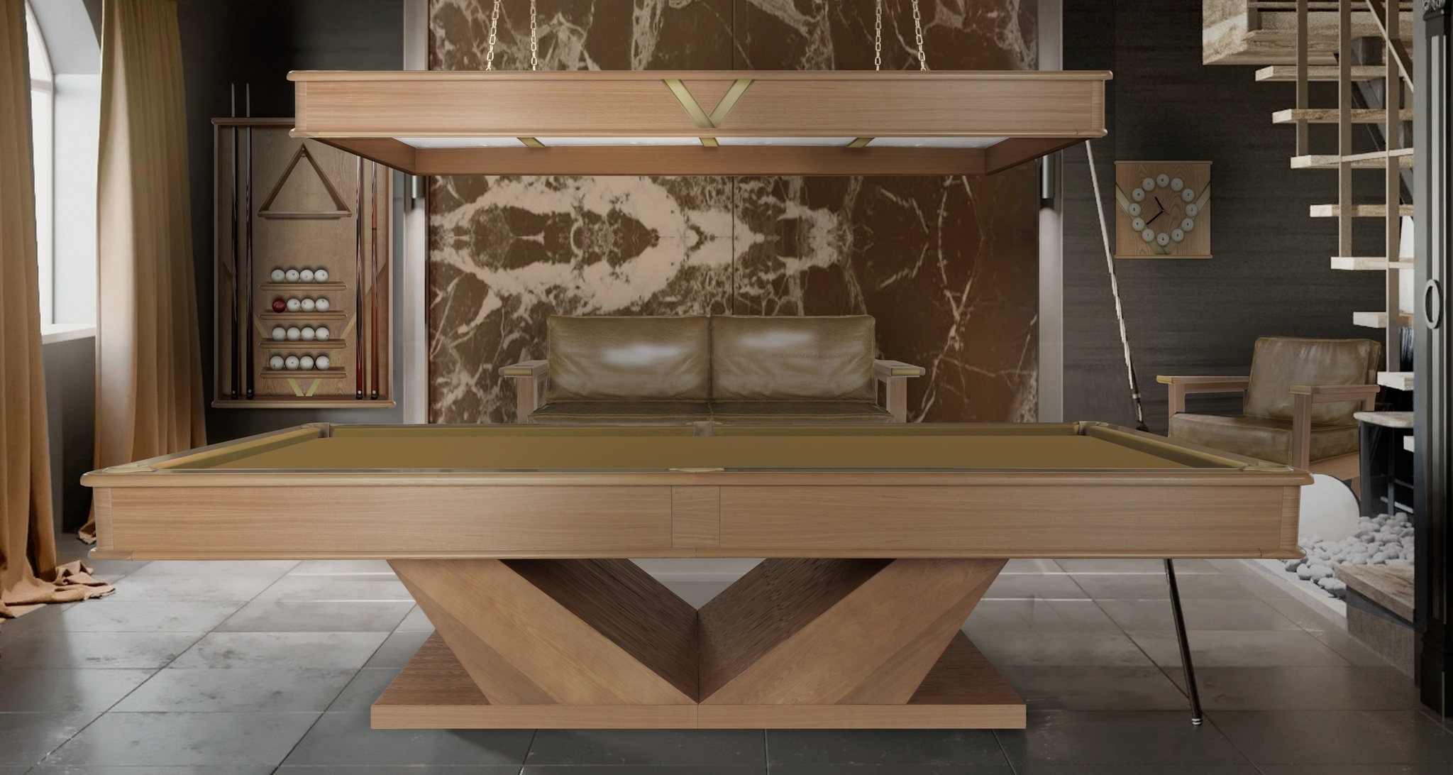 Центральным объектом коллекции является бильярдный стол Techno – один из самых ярких представителей столов современной стилистики. Выразительный силуэт V-образных ног задает характер этому столу и добавляет визуальной легкости конструкции.