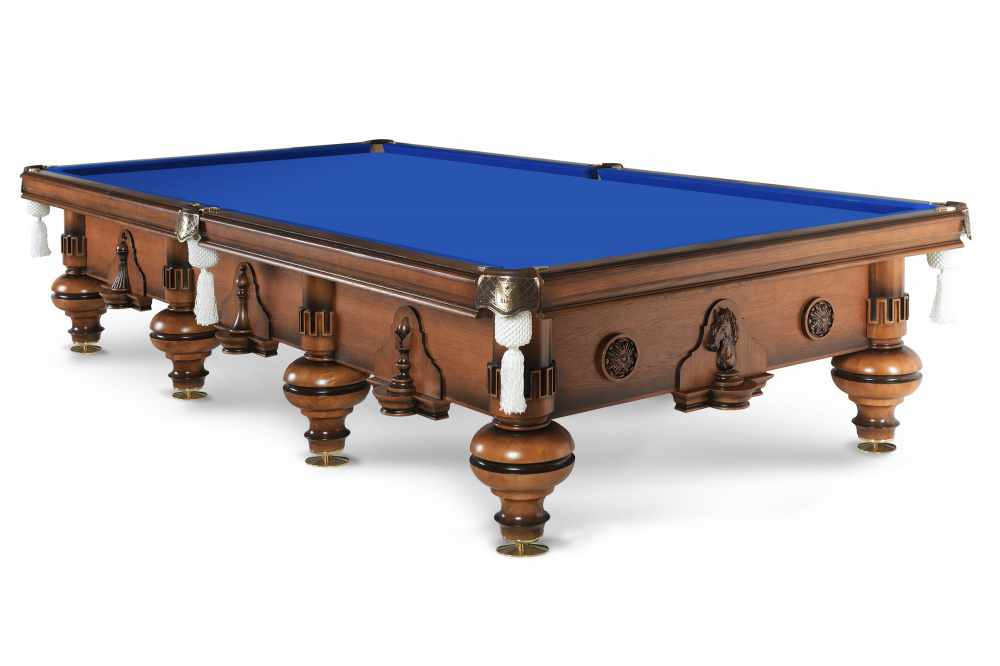 Художественная ценность модели заключается в четком ритме резных шахматных фигур, строгих пропорциях, комбинации фактур разных пород дерева и выразительной патинированной выкраске. В построении используется технология безупречного крепления борта к плите - Mount Perfect, которая гарантирует повышенную жесткость конструкции. Лузы отделаны геральдическим тиснением, сетки ручного плетения.