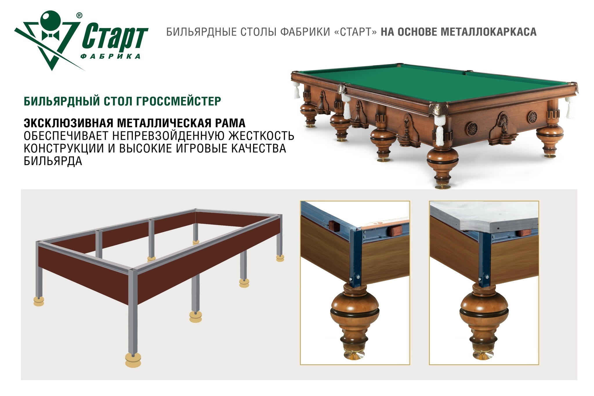 В конструкции стола используется уникальная разработка Фабрики «Старт» – эксклюзивная металлическая рама. Такой конструкторский прием обеспечивает непревзойденную жесткость и высокие игровые качества бильярдного стола.