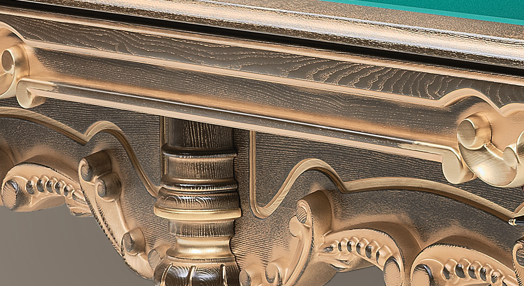 Бильярдный стол «Император Голд» поистине уникален. Натуральный массив клена, резные элементы, неповторимый дизайн лафета и ног. Шикарная отделка всей поверхности стола и аксессуаров золотой пастой и сусальным золотом в 23 карата, а также специальная технология искусственного старения древесины делают стол «Император Голд» настоящим произведением искусства.