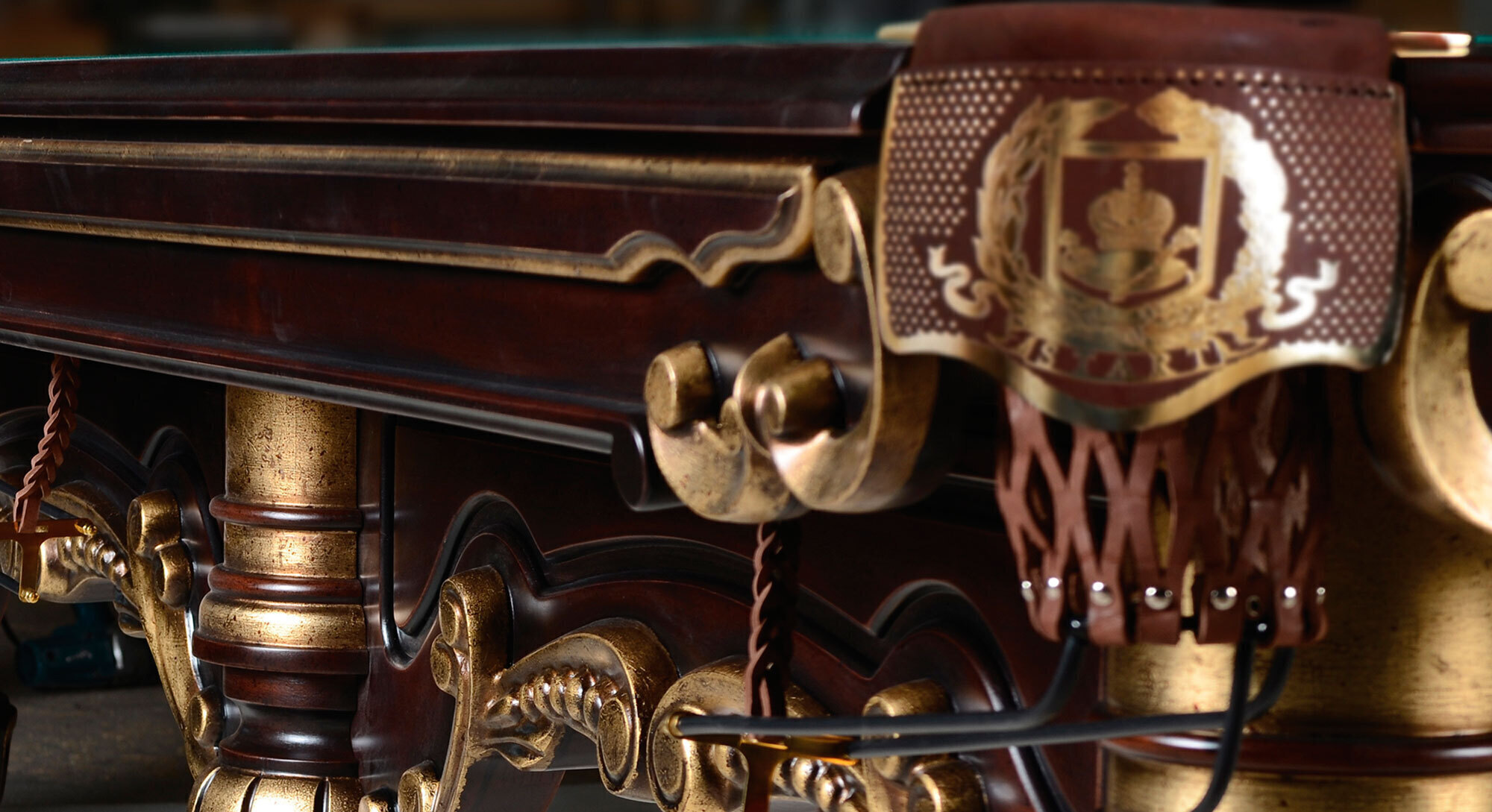 Бильярдный стол «Император-Люкс», украсит любые апартаменты. Резные узоры на лафете из натурального дерева, качественный сланец игрового поля, лучшие сукно и бортовая резина. С художественной точки зрения подлинным произведением искусства «Император-Люкс» делает выкраска. Шикарная отделка элементов стола поталью, по старинной технологии золочения. Ритм золоченых элементов объединяет резьбу ручной работы. Авторское патинирование и семь тонких слоев лака придают золоту глубину, а древесине благородный вид.