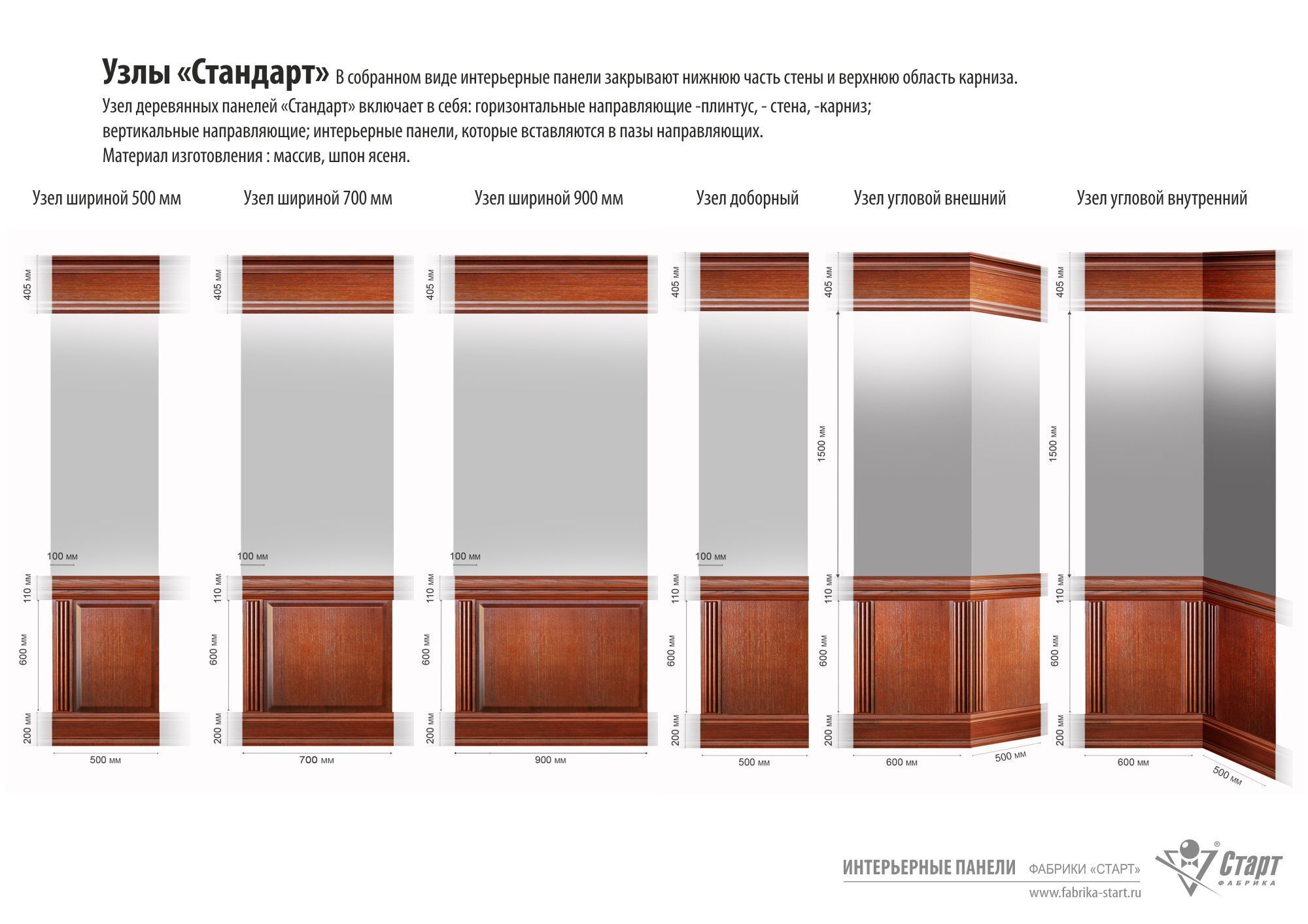 Узел деревянных панелей «Стандарт» включает в себя: горизонтальные направляющие -плинтус, - стена, -карниз;
