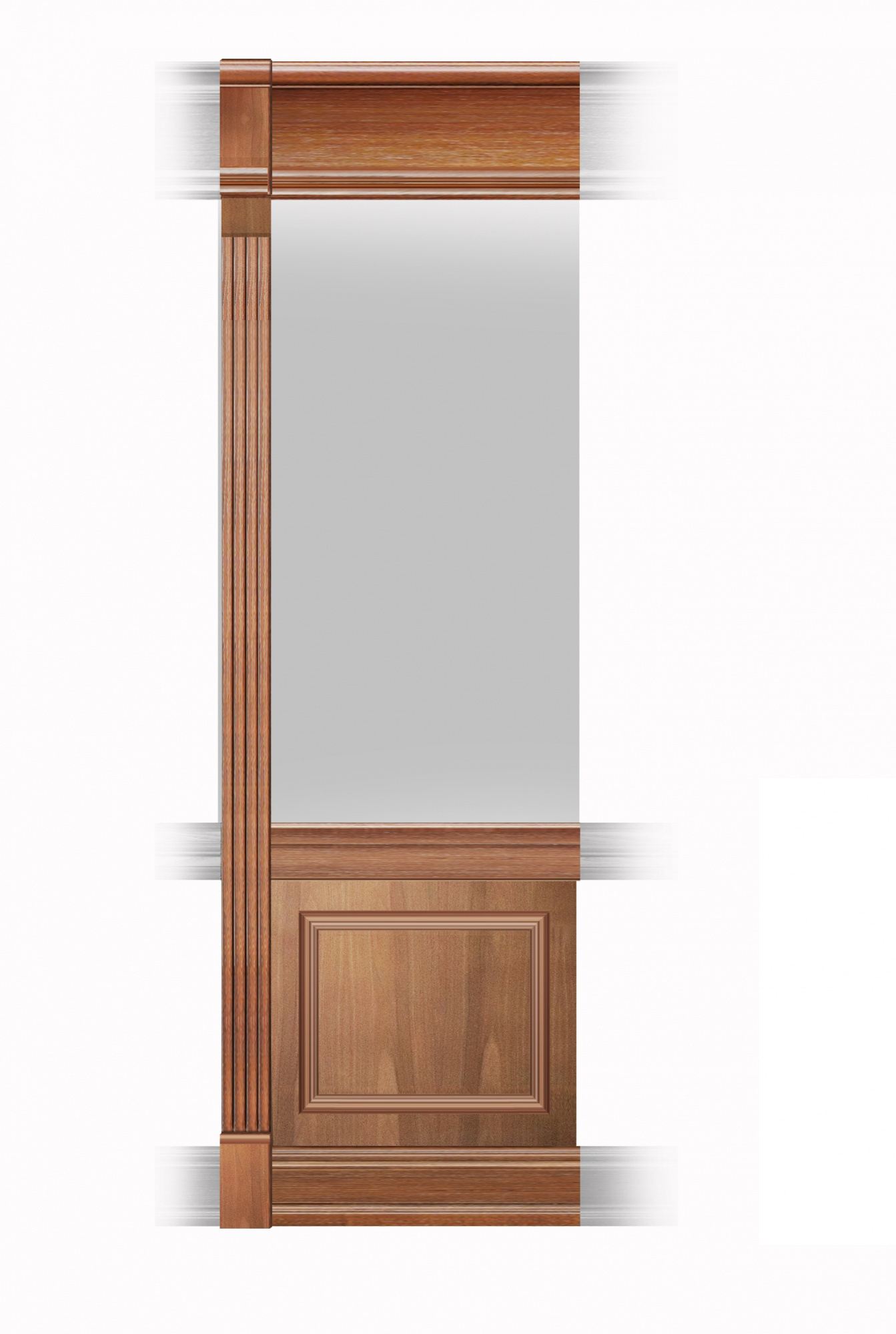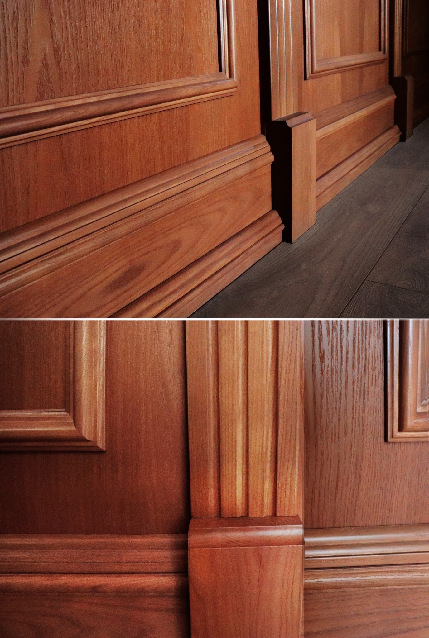 В собранном виде интерьерные панели закрывают нижнюю часть стены и верхнюю область карниза. Узел деревянных панелей «Премиум» включает в себя: горизонтальные направляющие -плинтус, - стена, -карниз; вертикальные направляющие; интерьерные панели, которые вставляются в пазы направляющих.