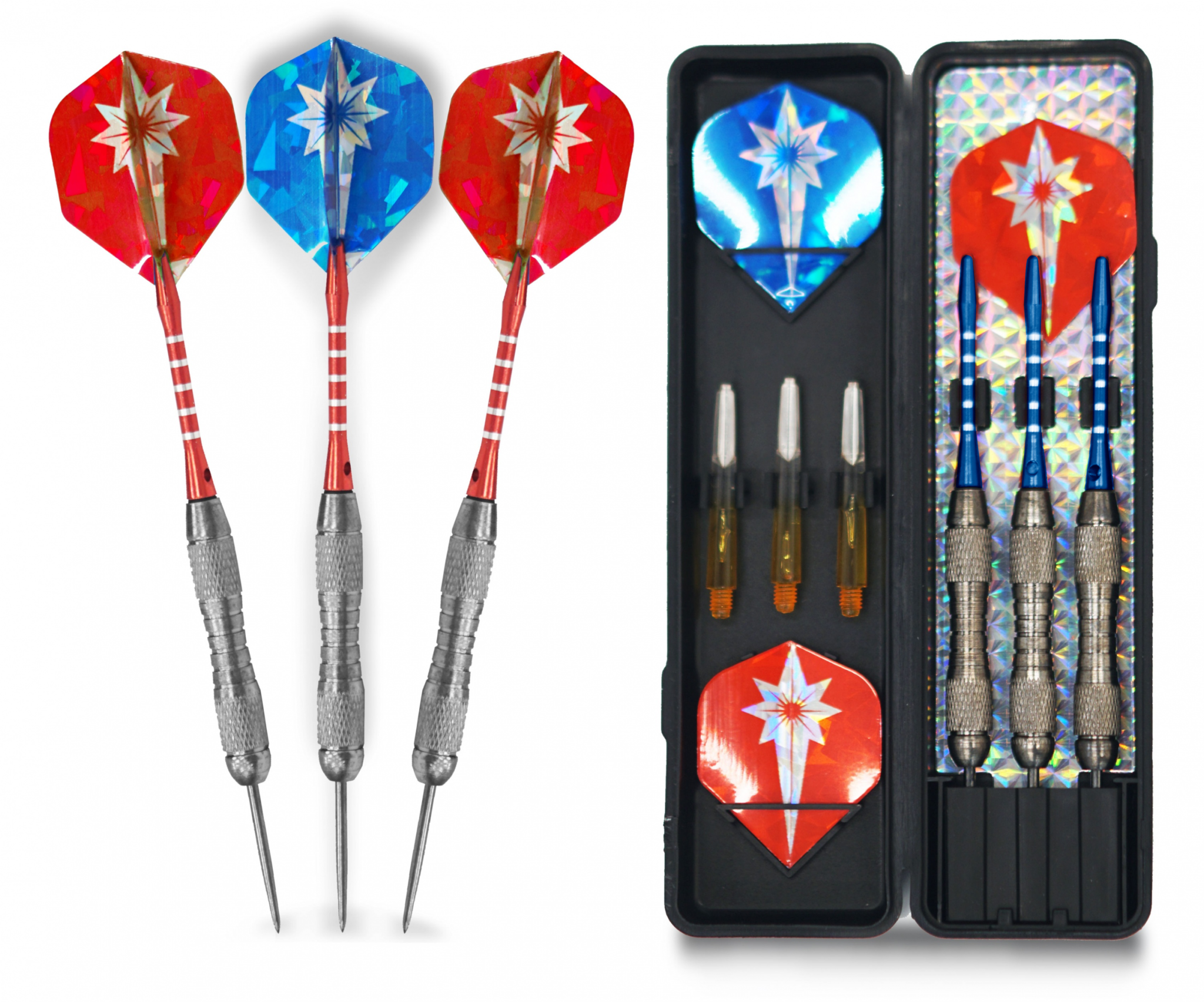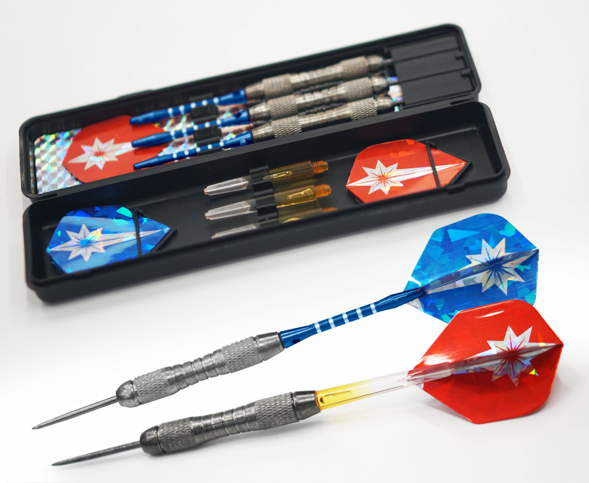 Комплект дротиков для игры в дартс весом 21 гр. Дротики со стальными иглами для классических мишеней. В комплекте 3 собранных дротика, футляр для хранения.