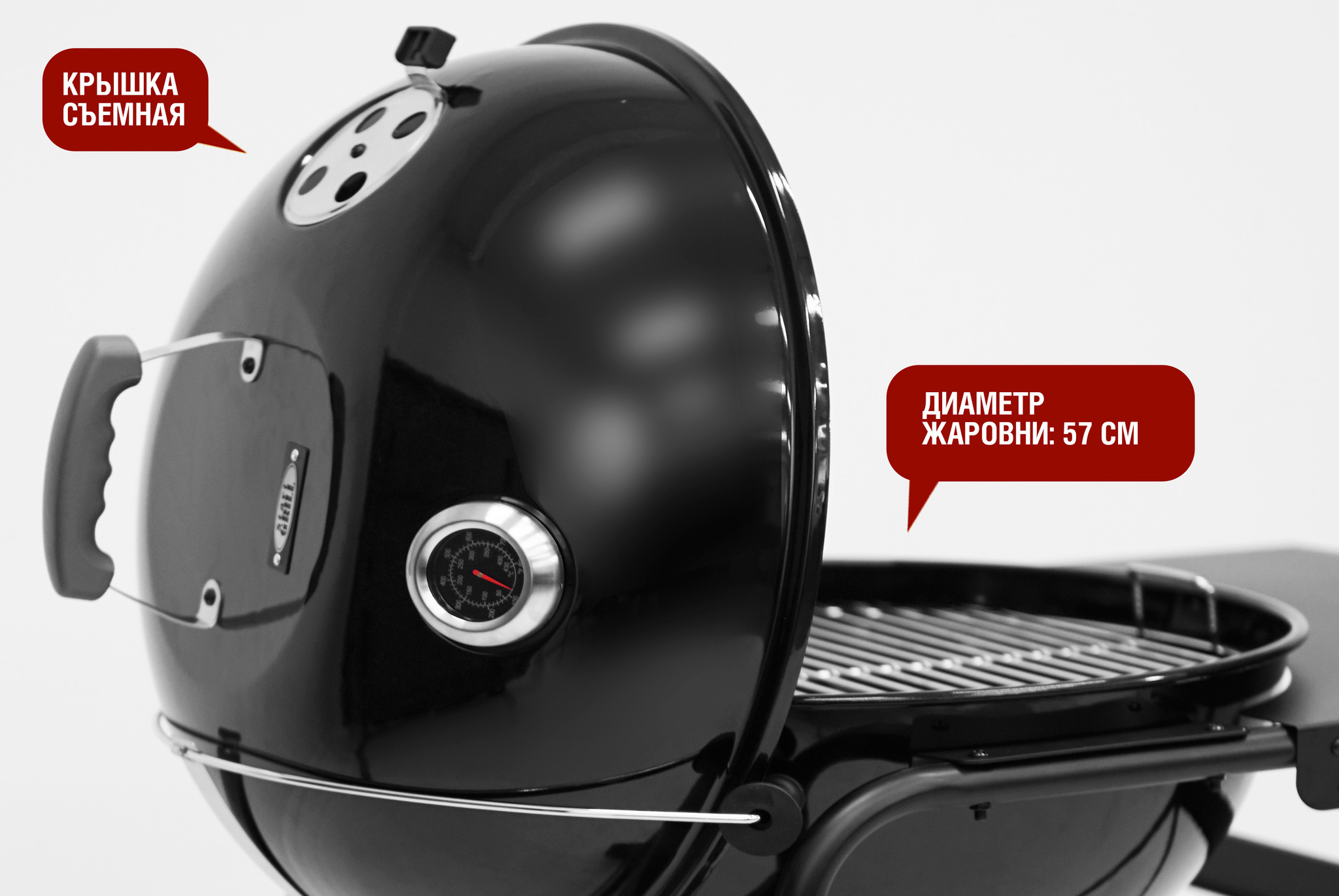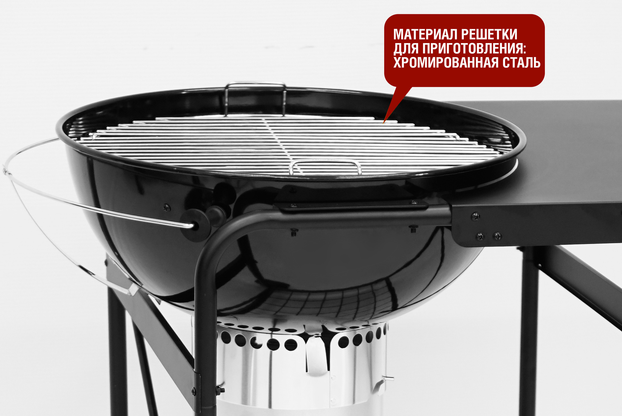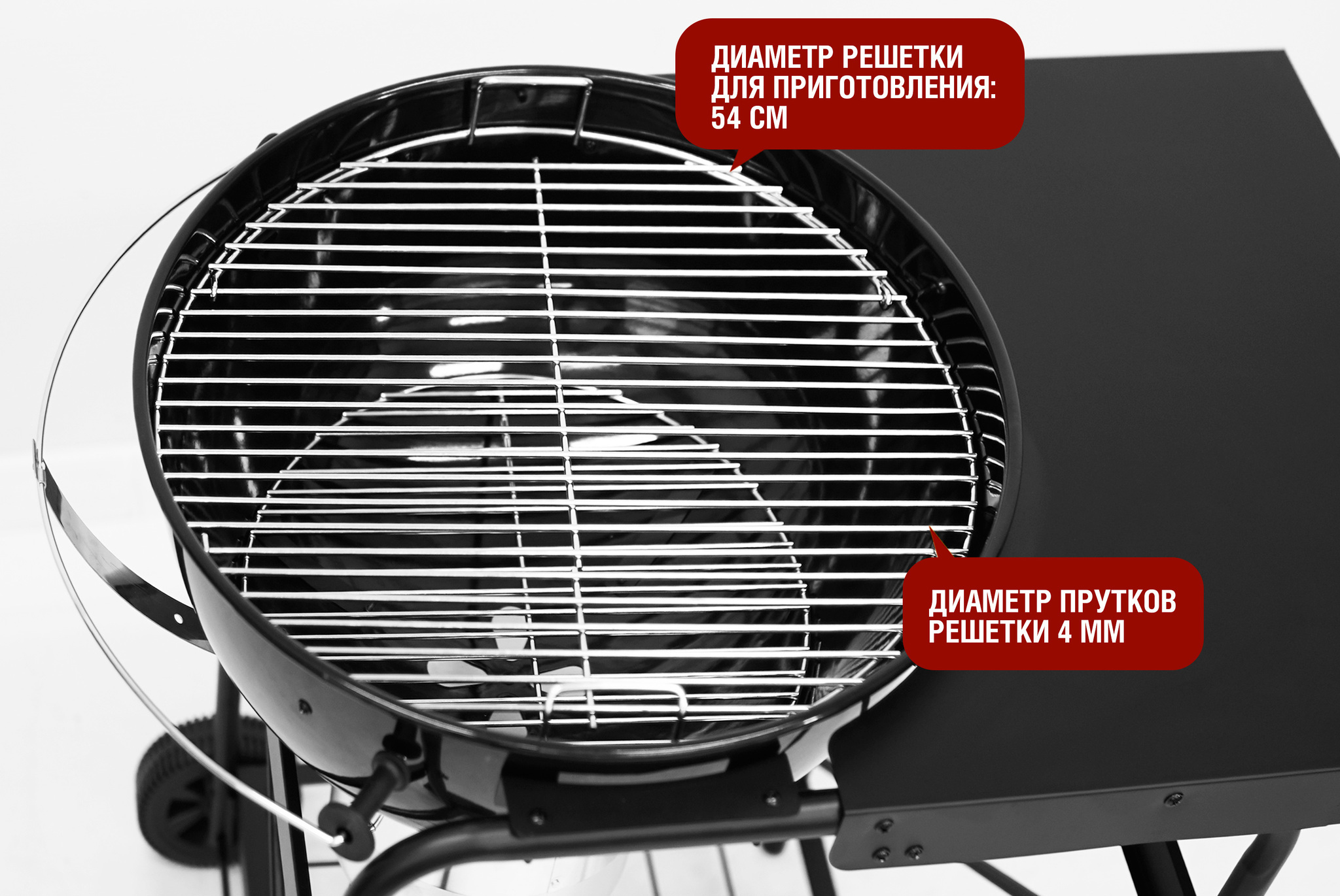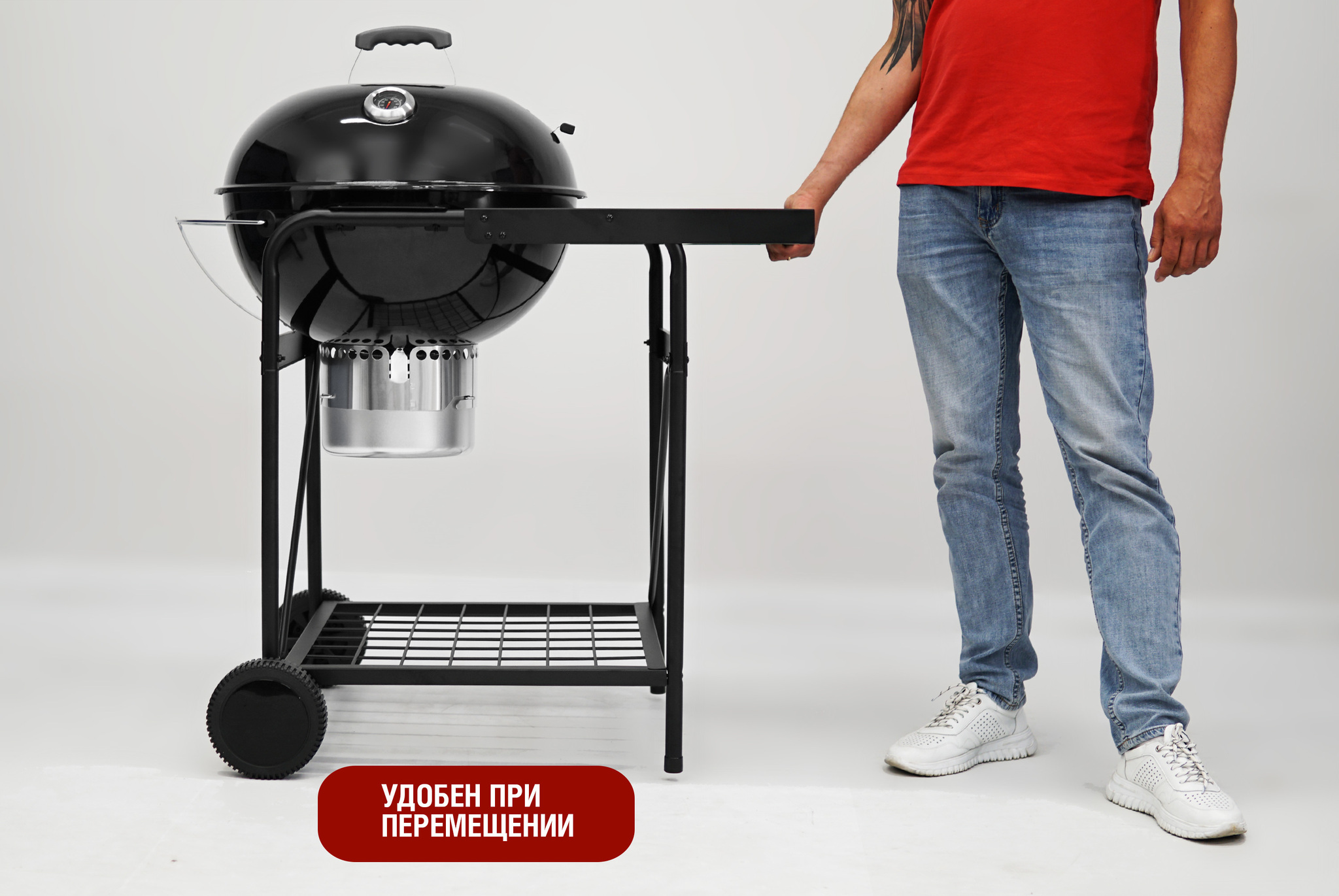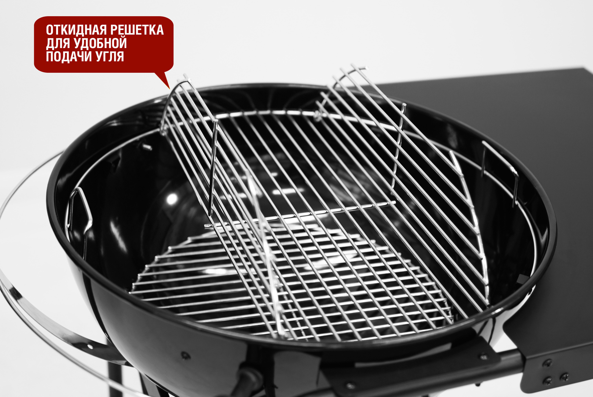 Гриль оснащен монолитными устойчивыми опорами колосника и решетки для приготовления. В комплекте поставки предусмотрены два захвата решетки для быстрого и безопасного снятия. Откидная часть решетки позволяет без лишних усилий добавить уголь. Модель оснащена большими транспортировочными колесами для удобного перемещения, а также функциональной нишей для хранения различных аксессуаров. Большая боковая столешница для посуды и аксессуаров станет незаменимым и удобным дополнением при готовке. Боковой кронштейн для крышки гриля внесет еще больше удобства в процесс приготовления блюд.