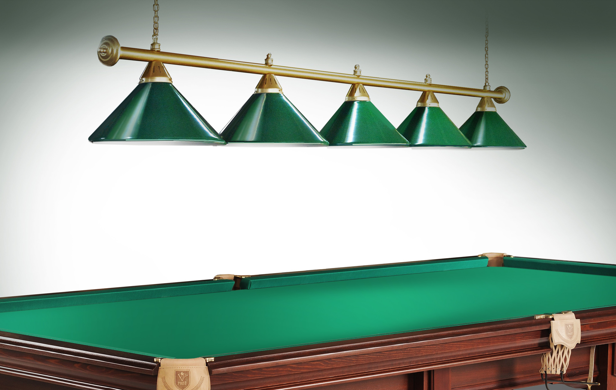 Светильники Startbilliards производства ФС «Горизонт» с 5-ю плафонами комплектуются к столам 10 футов. Укомплектованы цельной металлической штангой с полимерным покрытием. Штанга изготовлена из цельной трубы, что исключает искривление конструкции. Применение керамических патронов увеличивает срок эксплуатации светильника. Металлические плафоны крепятся с помощью зажимных пластин. Длина подвесной цепи 100 см — оптимальное расстояние для расположения источника света над игровым полем стола. В комплект включены две потолочные чашки. Штанга и плафоны поставляются в отдельных упаковках.