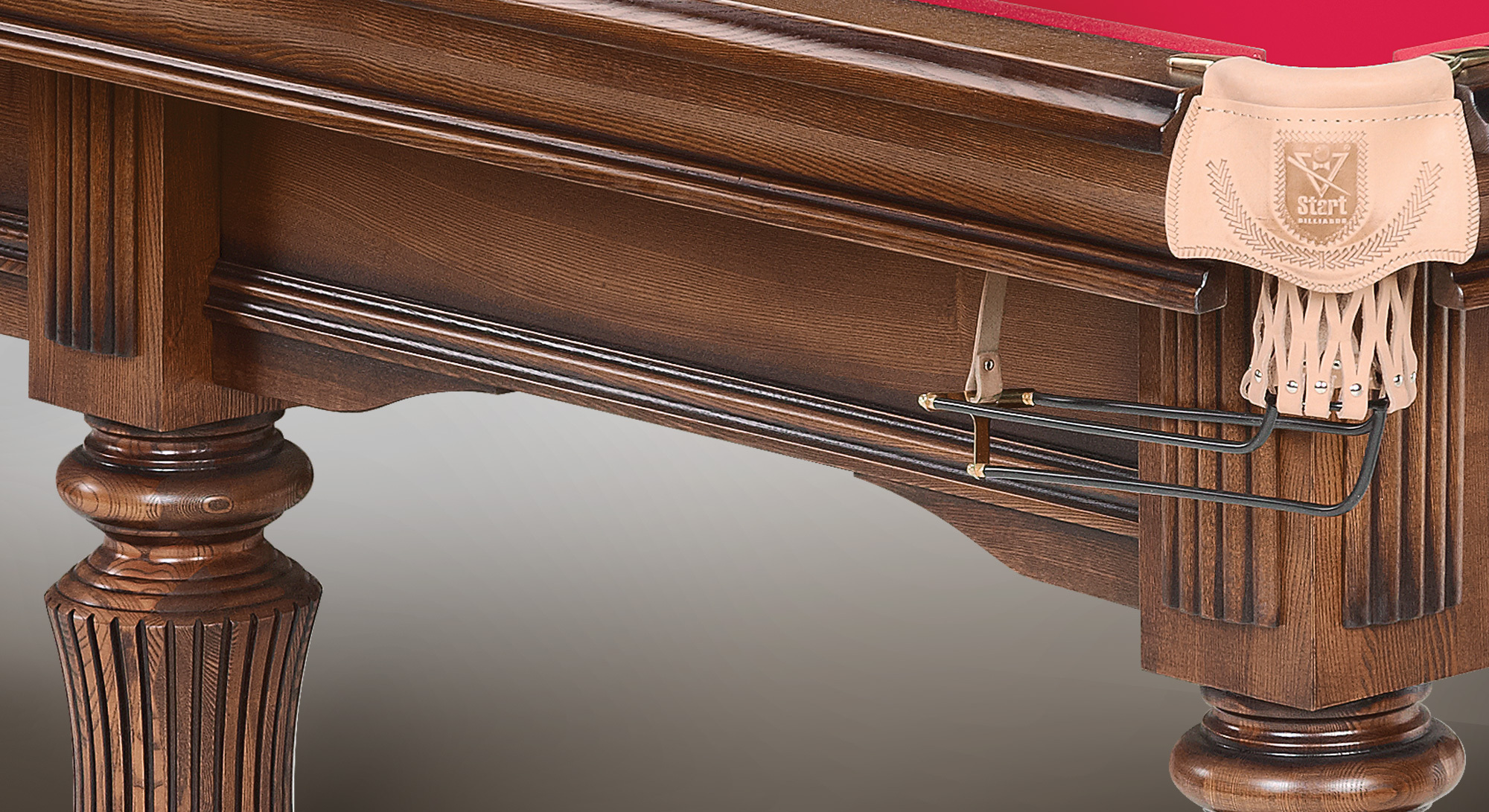 Стол декорирован патиной (эффект старины), что придает натуральному дереву особую выразительность. «Ливерпуль-Люкс» может быть полностью изготовлен из массива ясеня либо выполнен в комбинированном варианте ясень/сосна. Шульцевское крепление ног обеспечивает столу высокую устойчивость. Система плавающих гаек в вертикальном креплении бортов позволяет идеальным образом крепить борт к плите. Благодаря этой уникальной технологии борт и плита становятся единым монолитом. Профессиональные амортизаторы бортов Start Super Pro на долгие годы гарантируют отличный отскок шара.