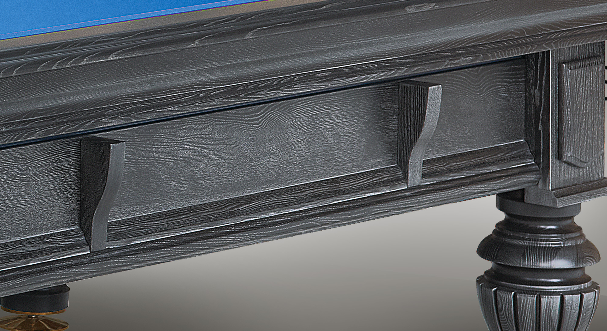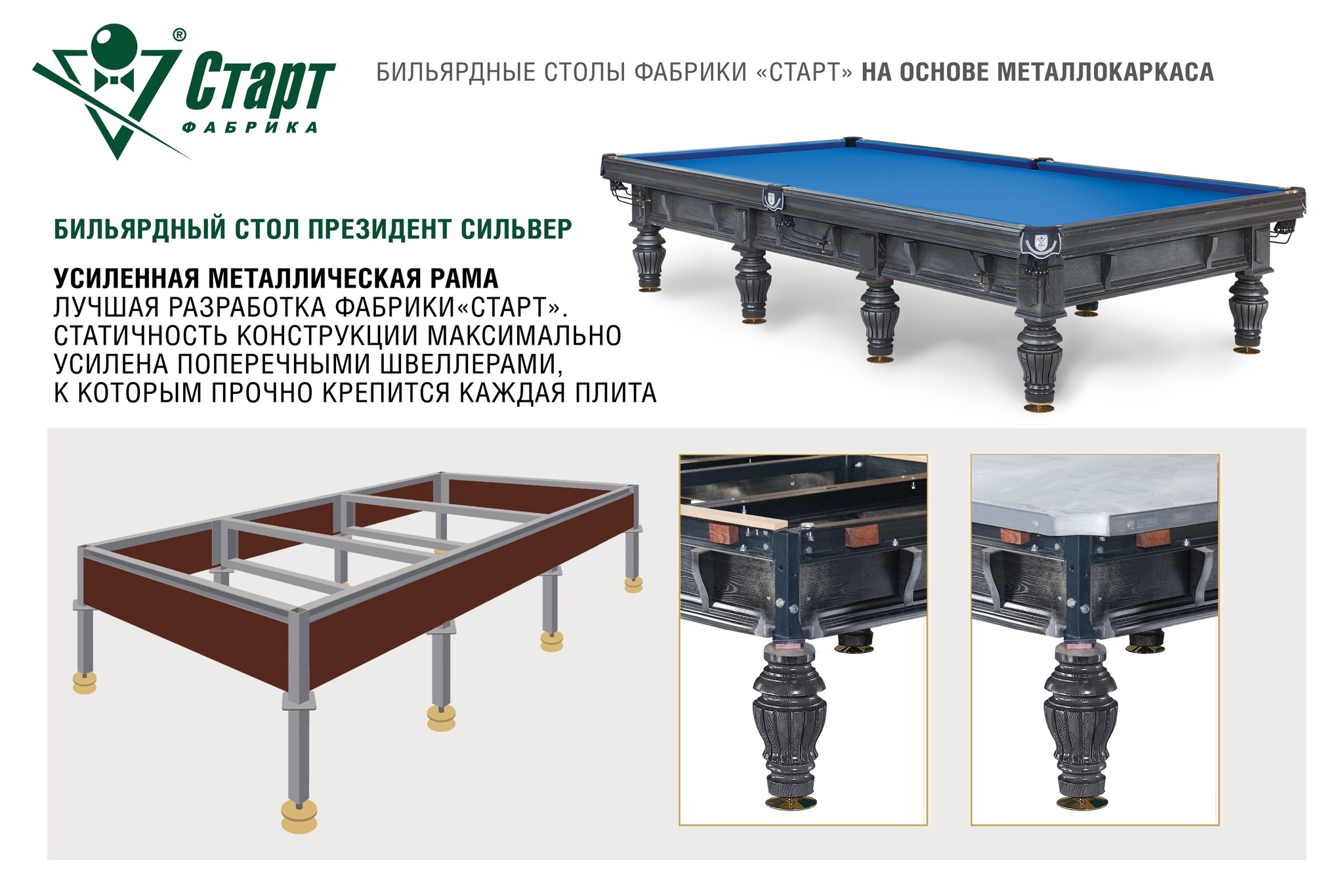 Эксклюзивная разработка Фабрики «Старт» с отделкой серебром. Бильярдный стол «Президент Сильвер» выполнен из ценных древесных пород в традиционной морской гамме. Особая технология искусственного старения древесины придает бильярдному столу сходство с палубой старинного корабля. Процесс обработки поверхности протекает в пять этапов. Основа грунтуется и тщательно шлифуется вручную. Затем наносится лак и краска темно-пепельного цвета. Далее осуществляется отделка серебром: серебряная паста втирается в древесные поры исключительно вручную. Последний штрих - шлифовка суконным материалом для большей выраженности структуры дерева и финишный слой лака. Бильярдный стол «Президент Сильвер» не только неповторим по стилю, но и соответствует всем требованиям, предъявляемым к высоко профессиональному бильярду.