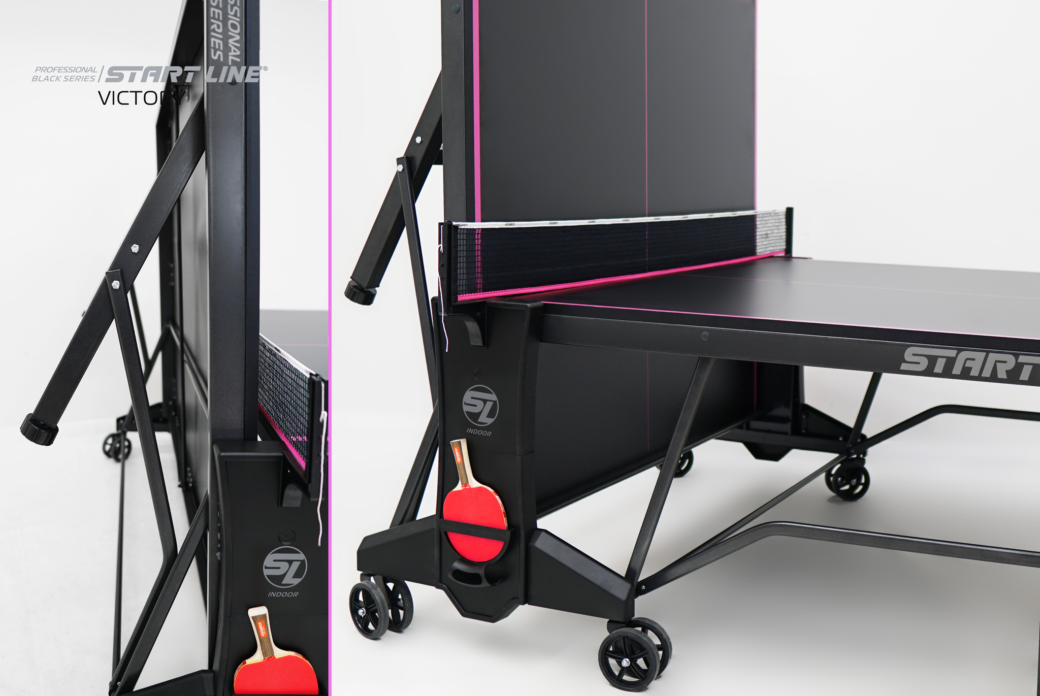 Модель Victory Black укомплектована удобным держателем для ракеток и мячей с покрытием Soft-touch и встроенной сеткой с натяжным механизмом, не требующей демонтажа при складывании. Начать игру можно в любое время, ведь все необходимое оборудование всегда под рукой.