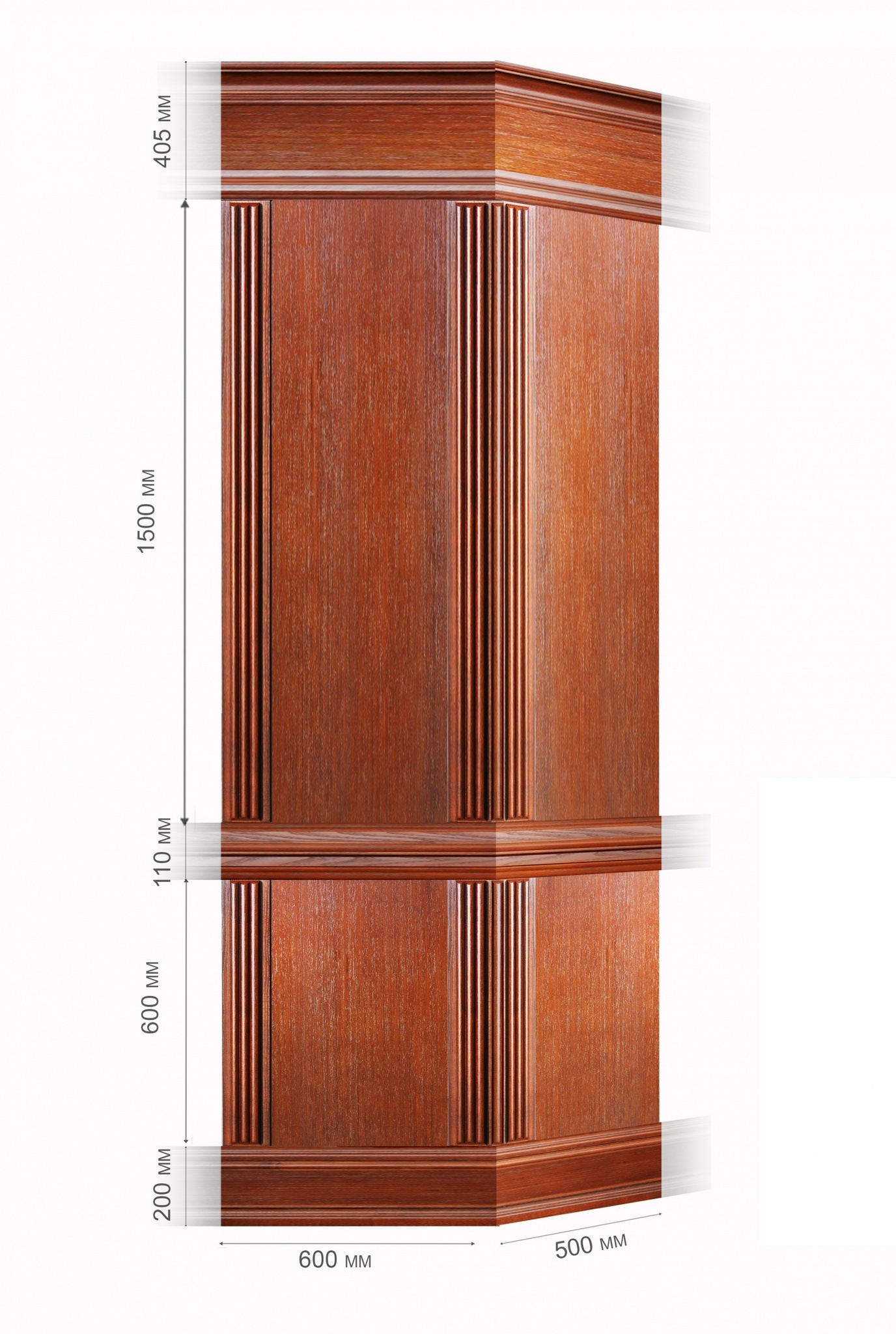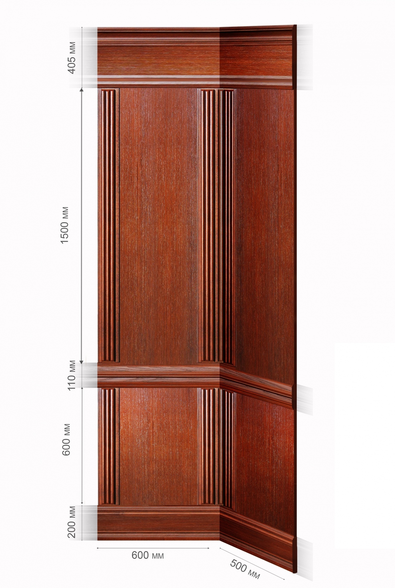 В собранном виде интерьерные панели закрывают нижнюю часть стены и верхнюю область карниза. Узел угловой деревянных панелей «Премиум» включает в себя: карниз; горизонтальные направляющие; плинтус; вертикальные направляющие; доборные панели, которые монтируются на месте с учетом размера и рельефа прилегающей стены.